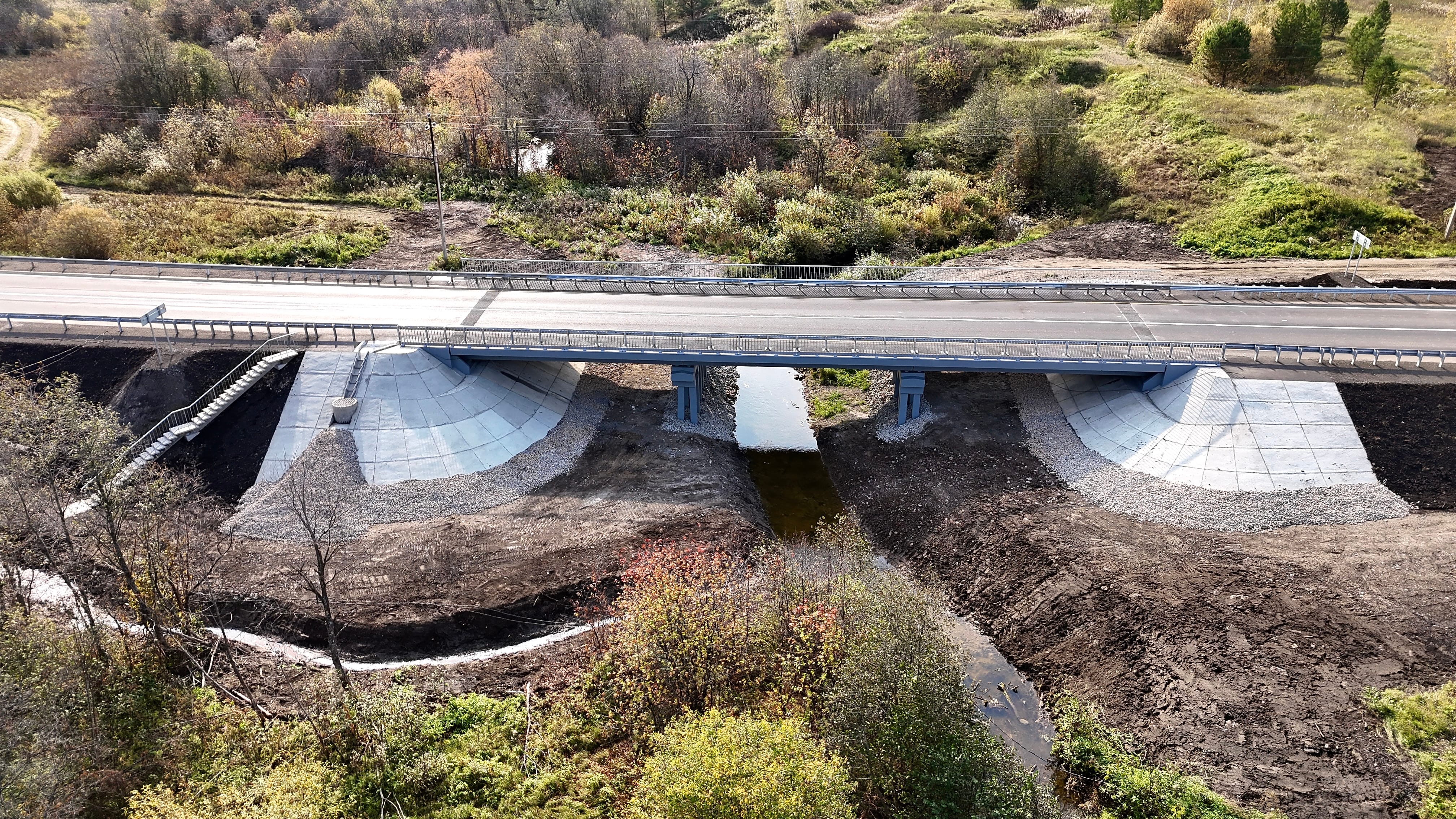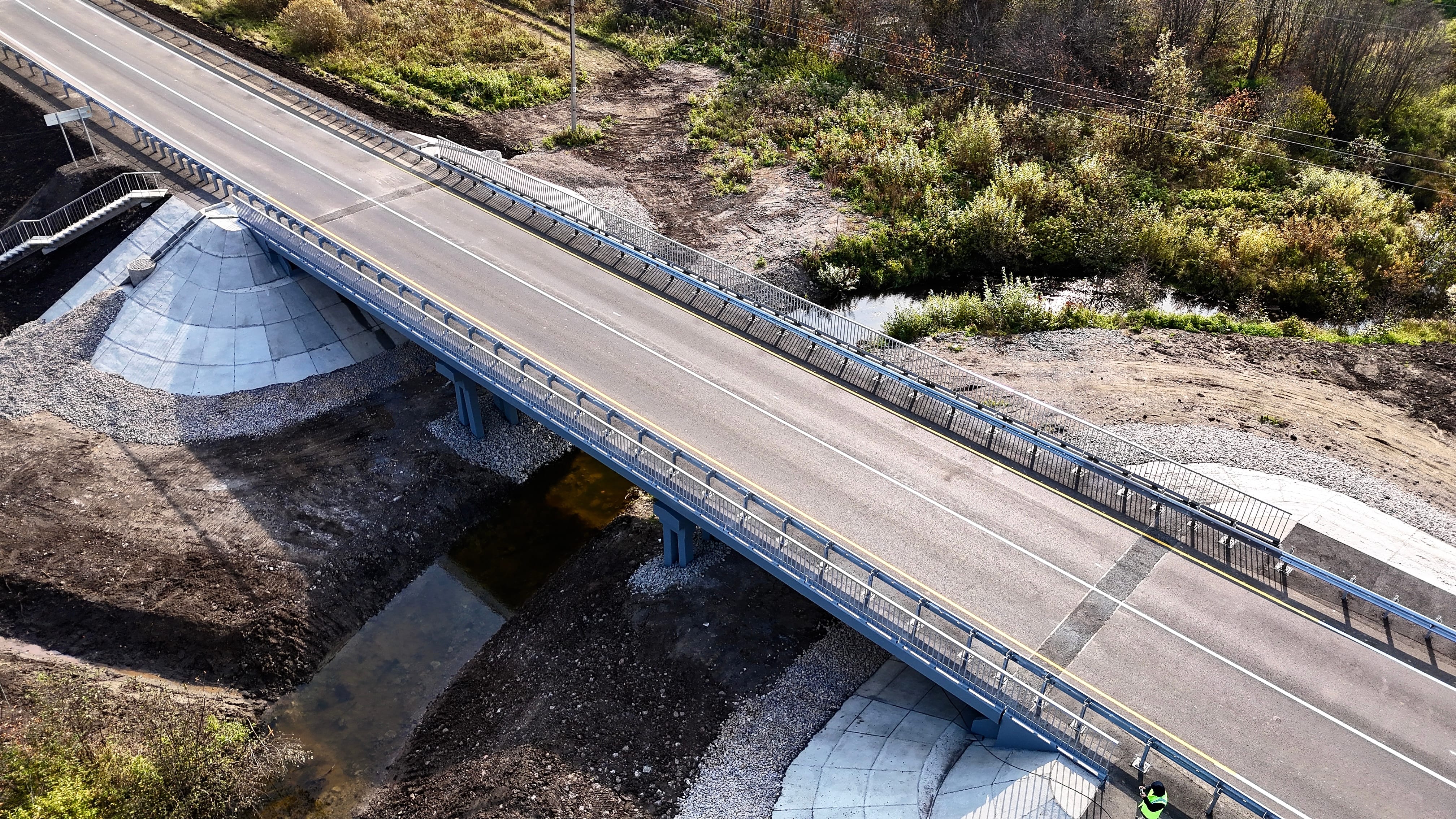 Работы на объекте выполнялись комплексно: специалисты выполнили сопряжение моста с насыпью, обустроили лестничный сход и водоотвод. Установили барьерное металлическое ограждение, перила и восемь дорожных знаков на сборных железобетонных фундаментах и металлических стойках. Проезжую часть дорожники разметили краской со световозвращающими микрошариками.